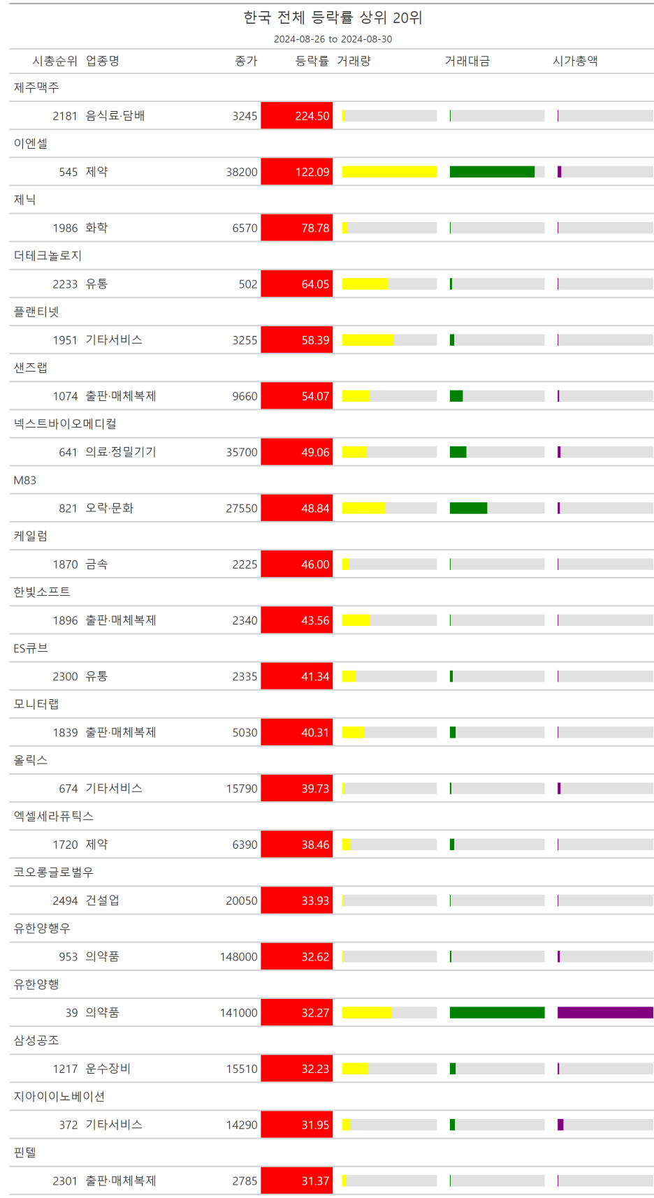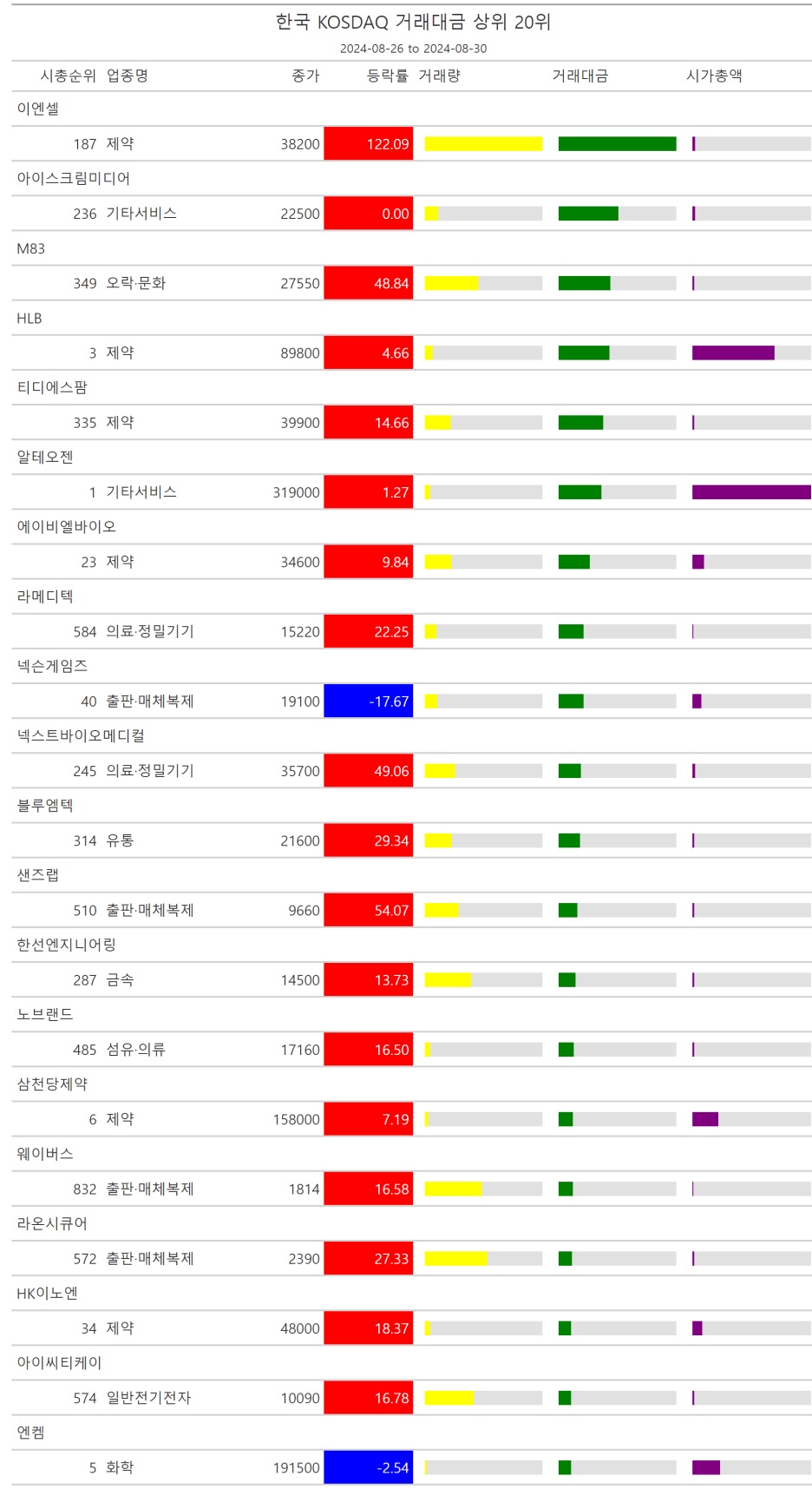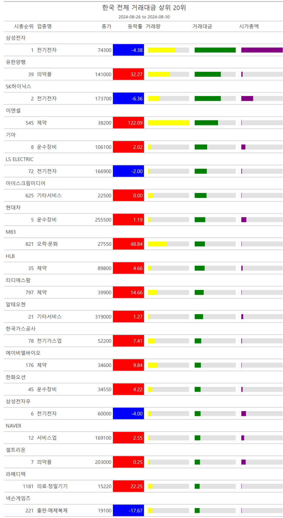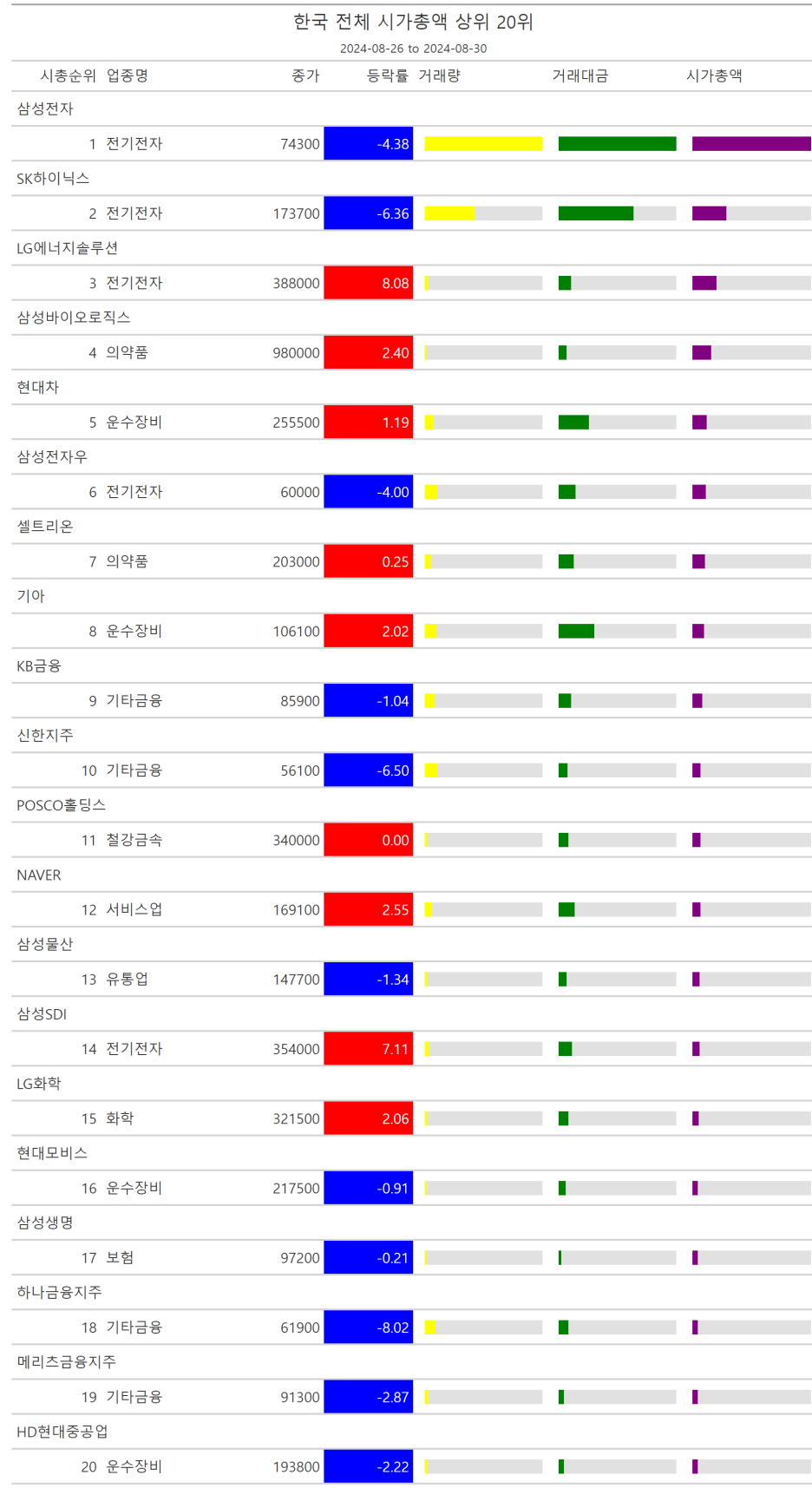 주간레이스, 2024년 8월 4주 한국(한국전체, 시가총액, 거래대금, 거래량, 등락률 상(하)위)