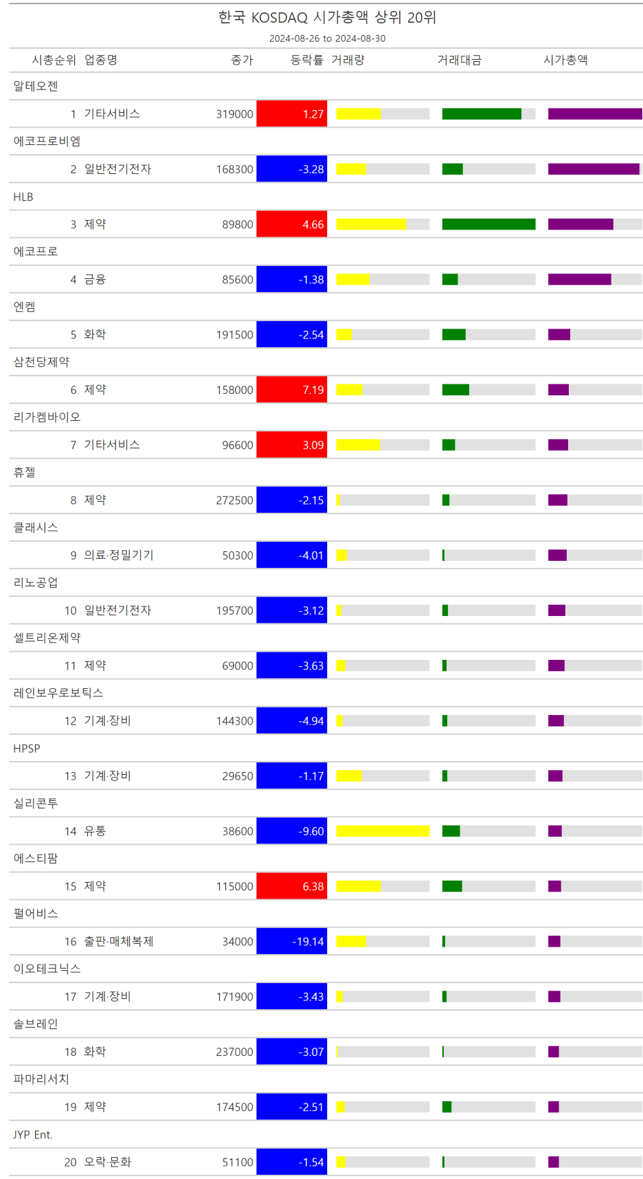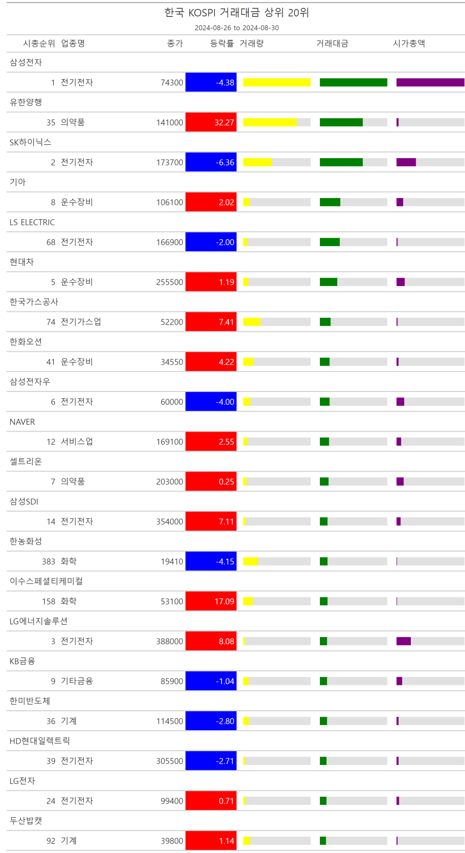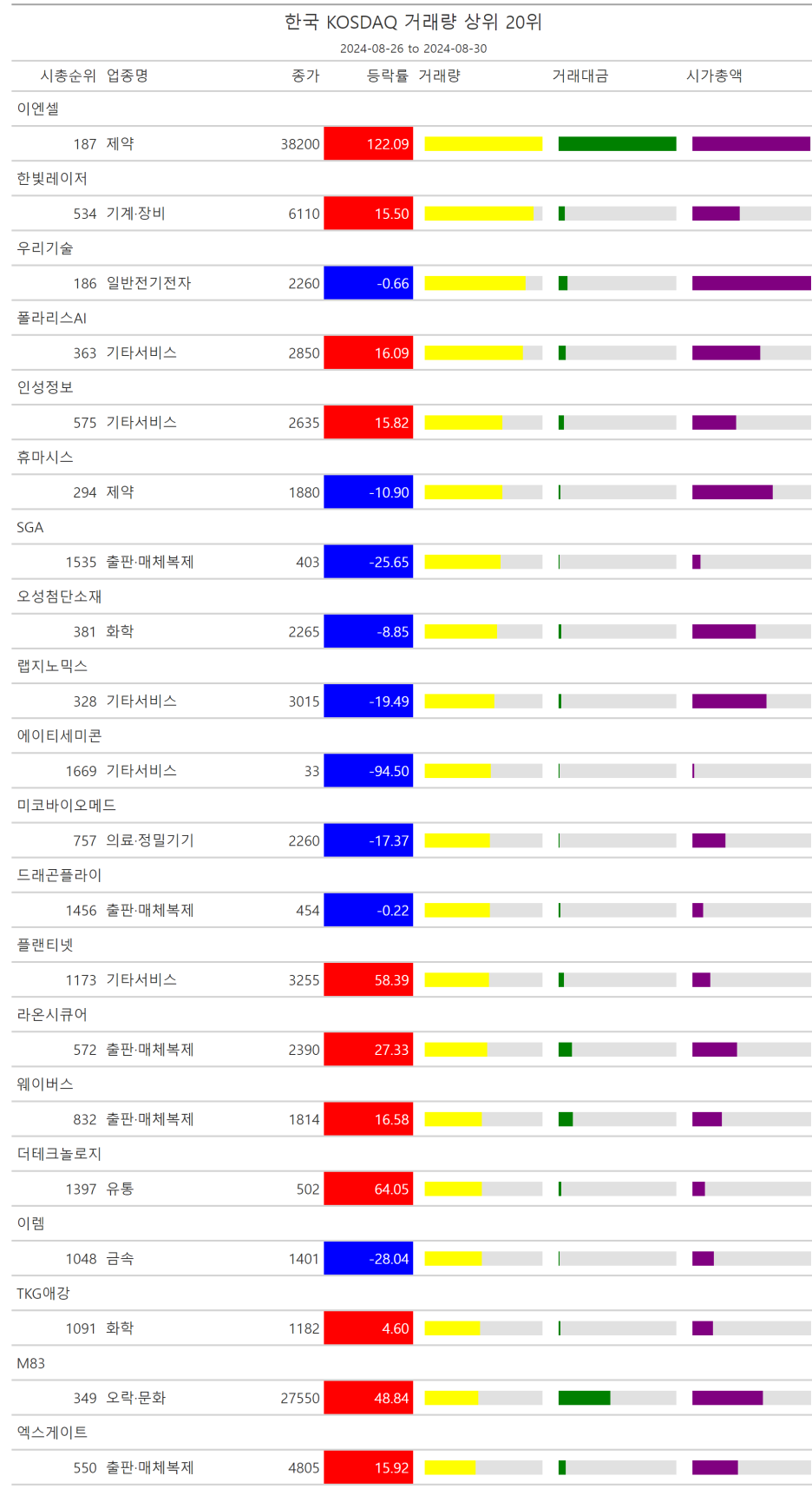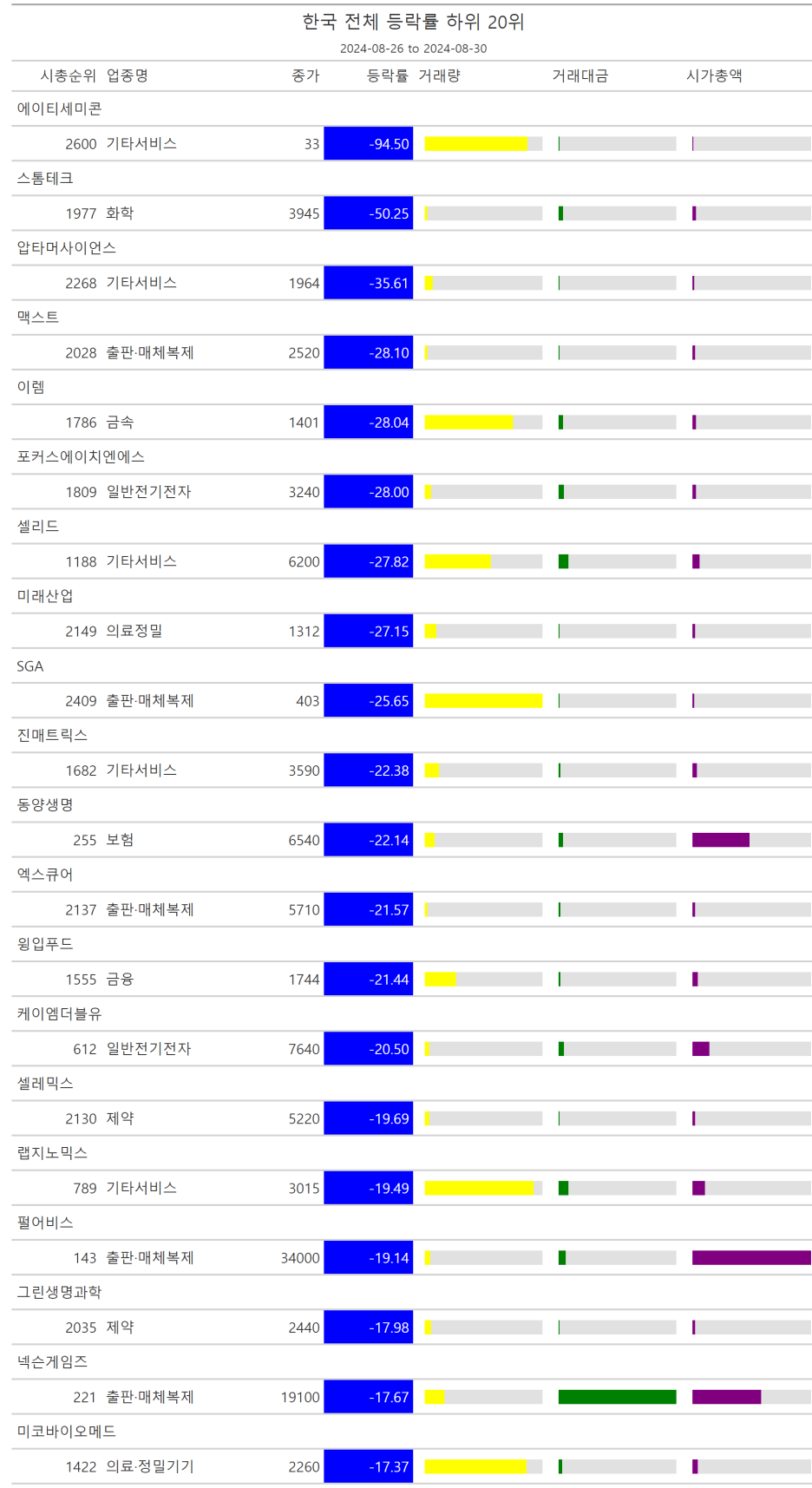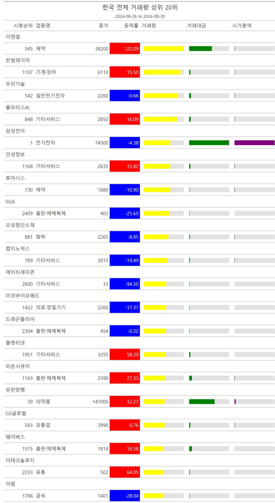 주간레이스, 2024년 8월 4주 한국(한국전체, 시가총액, 거래대금, 거래량, 등락률 상(하)위)