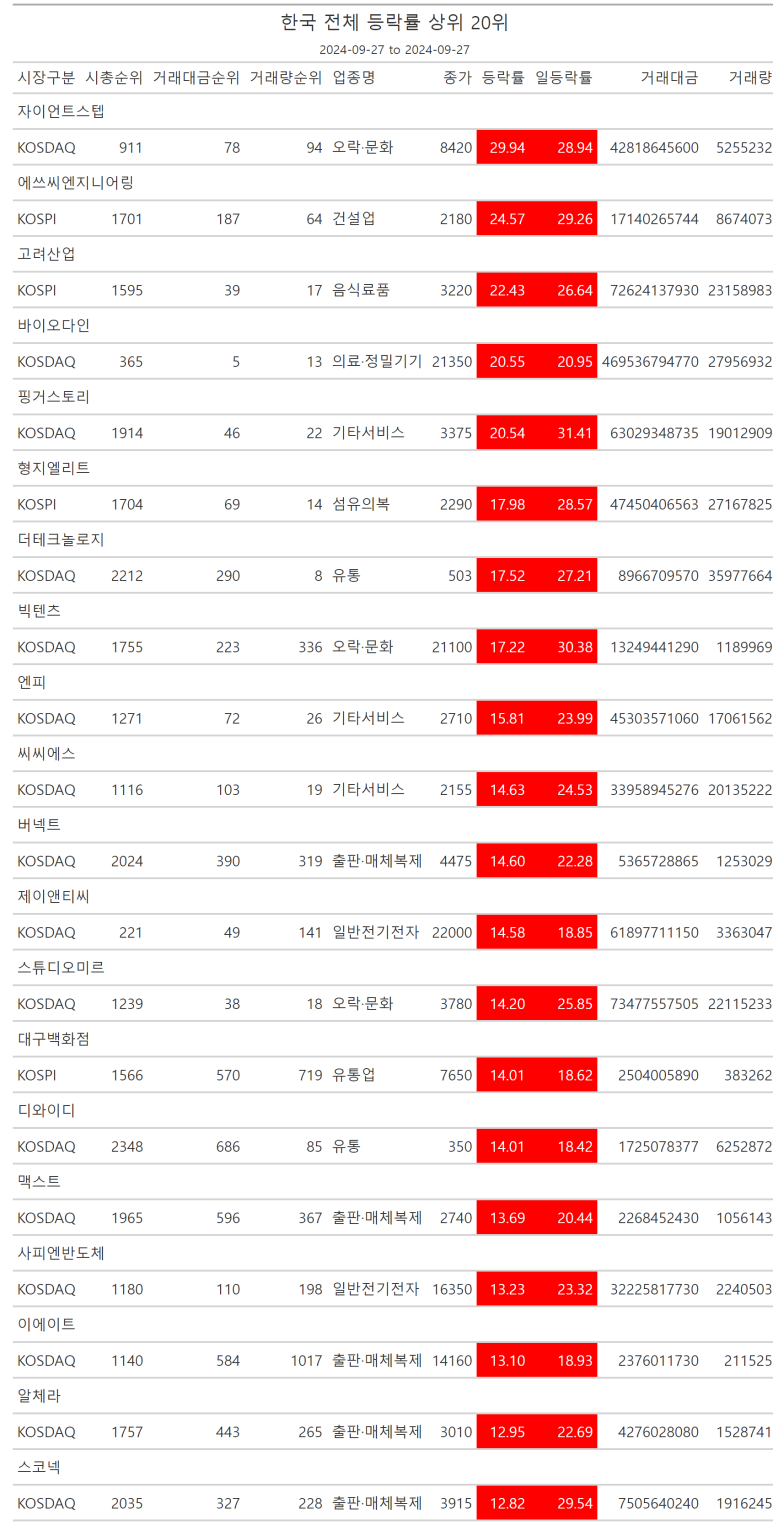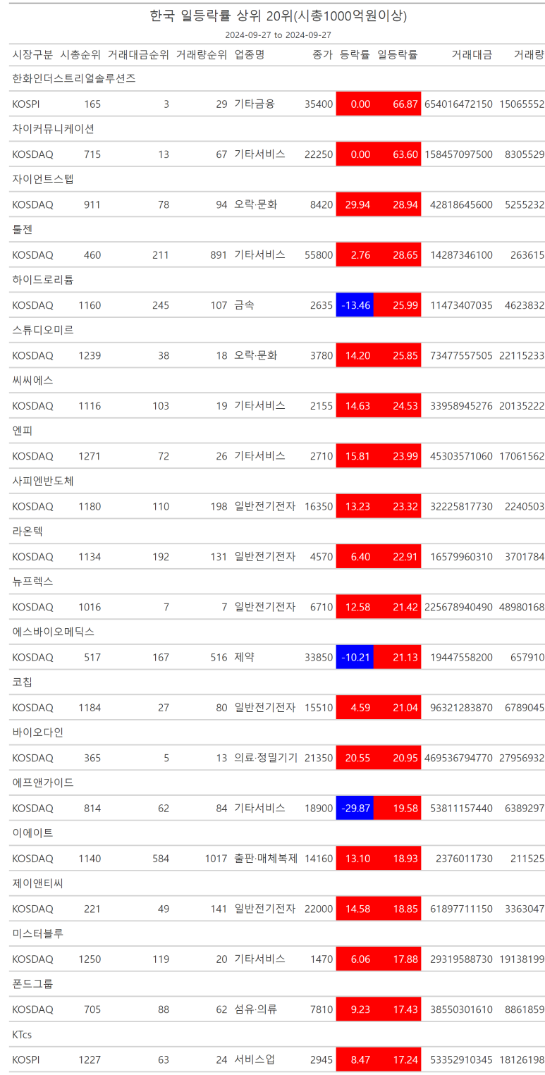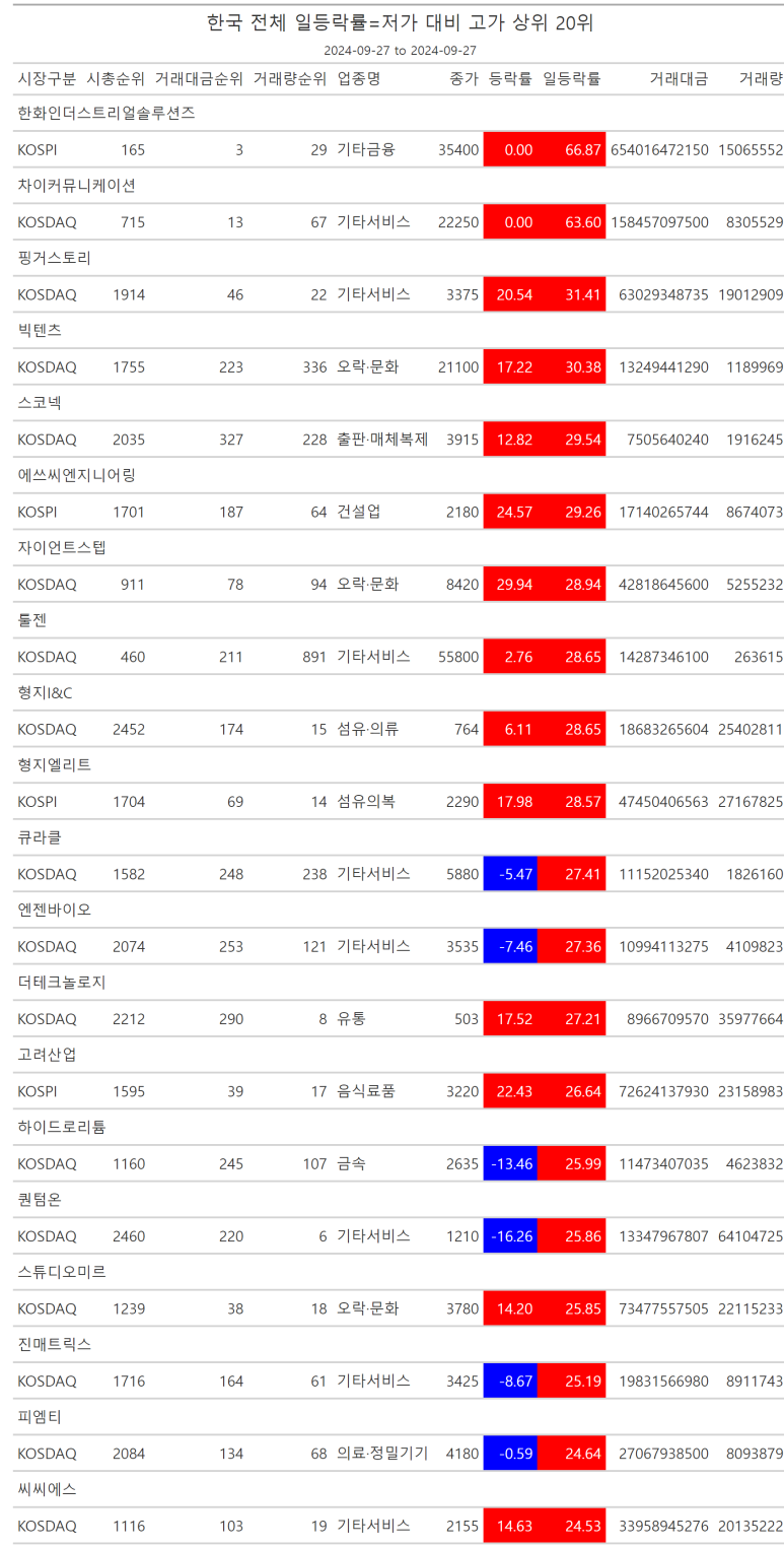2024.09.27 금요일, 일등락률표 - 저점 대비 고점