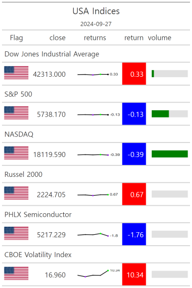 DOW +0.33%, S&P500 -0.13%, NASDAQ -0.39%