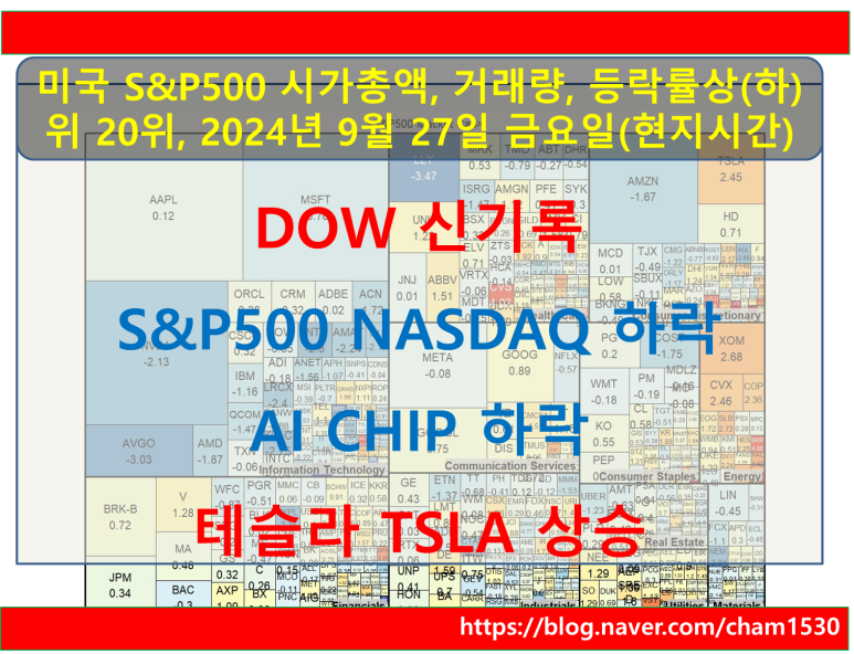 DOW 신기록, S&P500, NASDAQ 하락, CBOE VIX 공포지수 상승, AI칩 관련주 하락, 테슬라 TSLA 상승