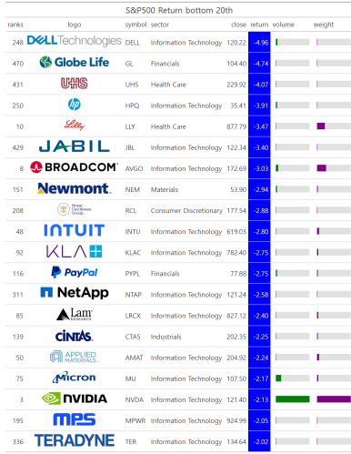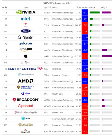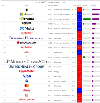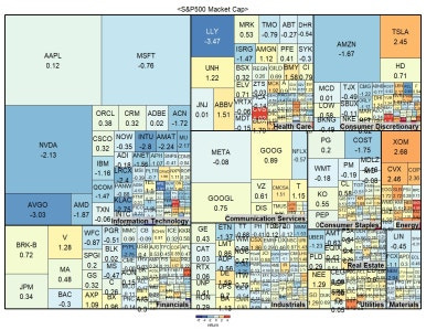 애플 AAPL +0.12%, 마이크로소프트 MSFT -0.76%, 엔비디아 NVDA -2.13%, 아마존 AMZN -1.67%, 메타 META -0.08%, 구글 GOOG +0.89%, 테슬라 TSLA +2.45%, 일리아릴리 LLY -3.47%, 브로드컴 AVGO -3.03%