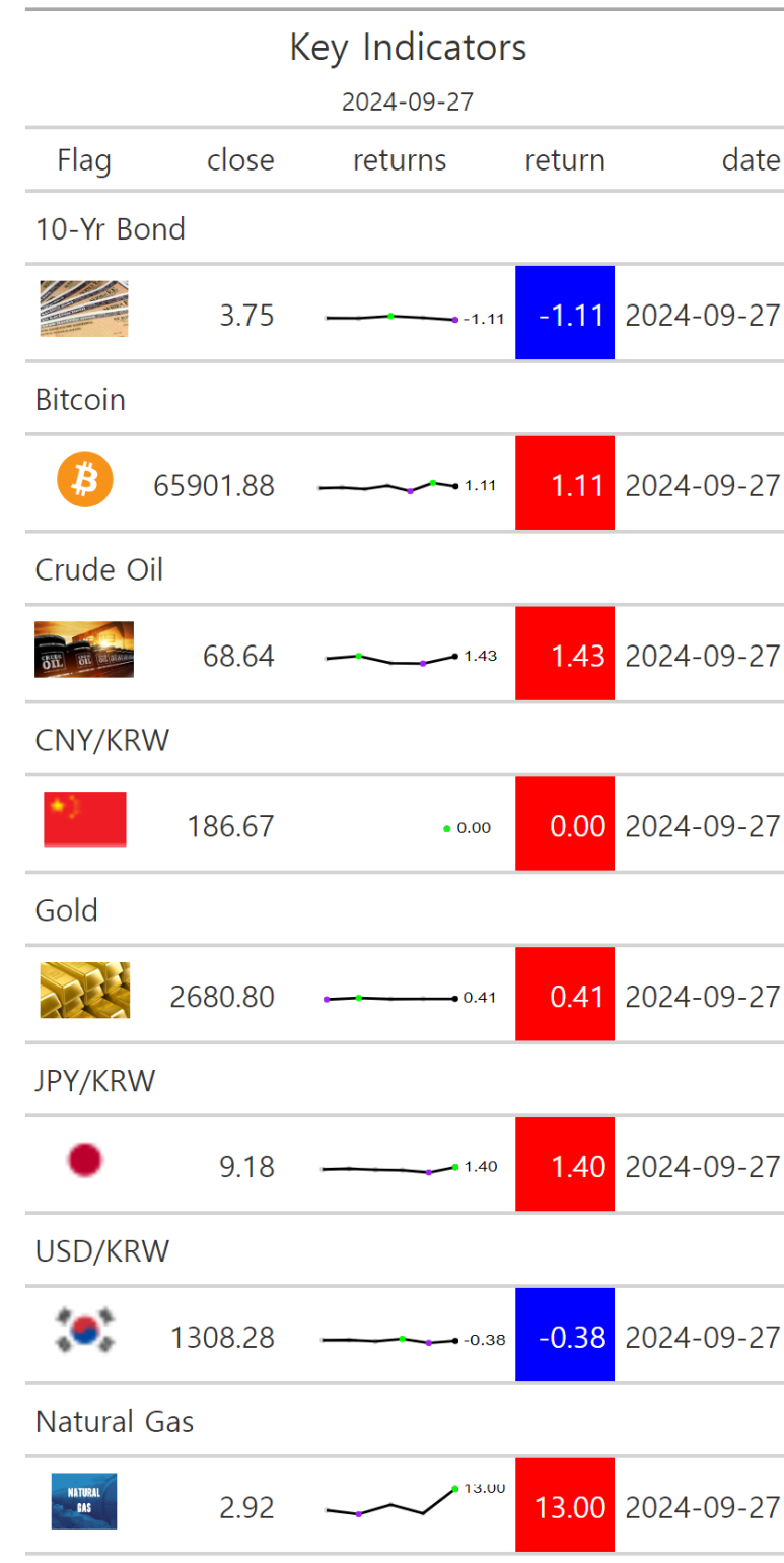 10년만기 채권 수익률 3.75%(-1.11%), Bitcoin $65901.88(+1.11%), Crude Oil $68.64(+1.43%), Gold $2680.80(+0.41%), 환율 1308.28원(-0.38%), 천연가스 2.92(+13.00%)