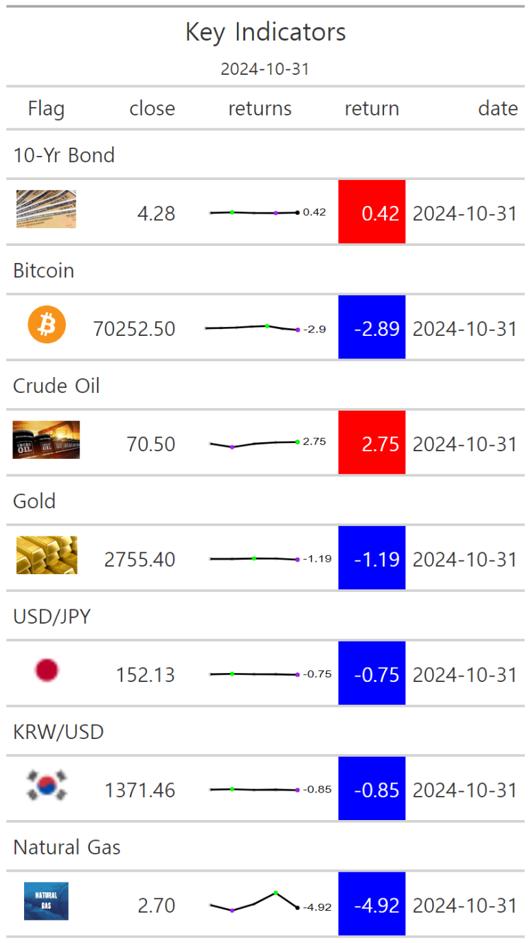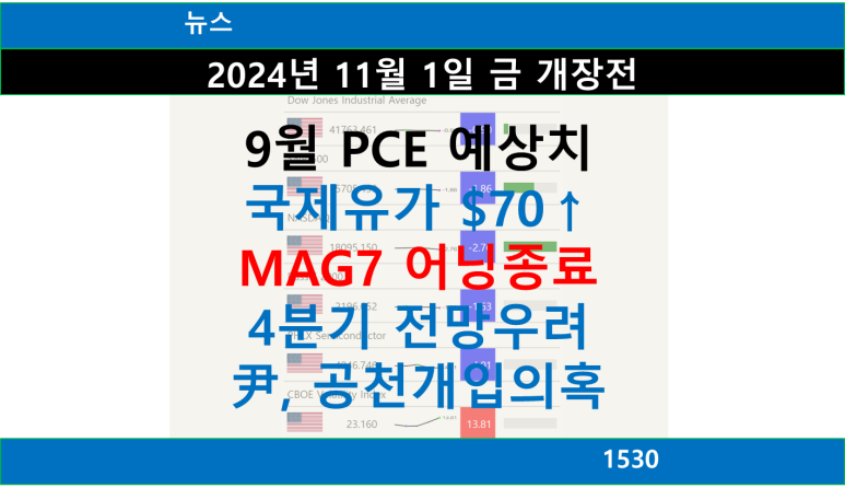 뉴스 개장전 요약, 국제유가 70달러 돌파, MAG7 어닝종료 4분기 실적 전망 우려 하락, 윤대통령 공천개입 의혹