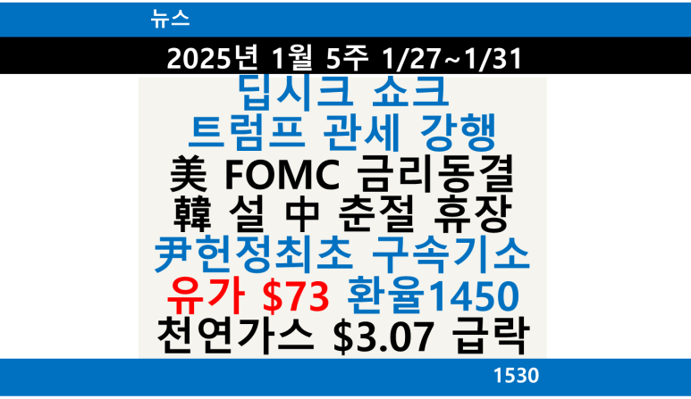 뉴스 주간 요약, 딥시크 쇼크, 트럼프 관세 강행, 美 FOMC 금리동결, 韓 설 中 춘절 휴장, 尹 헌정최초 구속기소, 유가 $73 환율1450, 천연가스 $3.07 급락